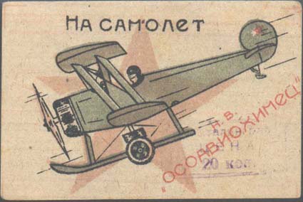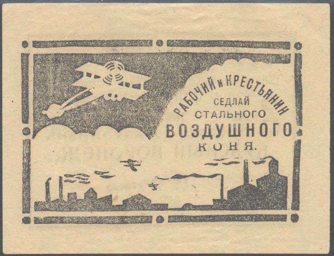 1923 г. Областной выпуск. Одноцветная двухсторонняя печать на желтоватой бумаге. На лицевой стороне в рамке разм. 95 х 63 мм из точек и линий три самолета-биплана, летящих над заводскими зданиями. Справа текст в пять строк: «Рабочий и крестьянин, седлай стального воздушного коня». На оборотной ст…