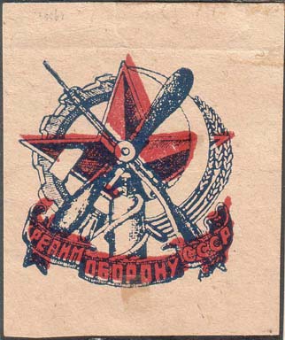 1932 г. Разм. 53 х 64 мм. Двухцветная печать на толстой желтоватой бумаге. В центре эмблема ОСОАВИАХИМ. На оборотной стороне фиолетовый оттиск прямоугольного штампа разм. 38 х 23 мм с текстом в пять строк: «Сталинградский Районный Транспортн[спортный]. СОВЕТ Осоавиахима Ю.В.Ж.Д. Цена 10 к.».