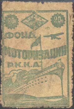 1932 г. Разм. 28 х 40 мм. Двухцветная печать на желтоватой бумаге. Нерегулярная зубц. В центре часовой на фоне грузового автомобиля с солдатами в кузове. Сверху текст в две строки: «Создадим фонд». Внизу слева номинал в круглой рамке и продолжение текста в две строки: «Моторизации Р.К.К.А.».