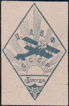 1925(?) г. Разм. 39 х 60 мм. Одноцветная печать на белой бумаге. В рамке в форме ромба в центре самолет-биплан, летящий вправо на фоне лучей восходящего солнца. Текст полукругом в две строки: «О.Д.В.Ф. С.С.С.Р.». Внизу текст: «г. Вологда». Ниже пятиконечная звезда.