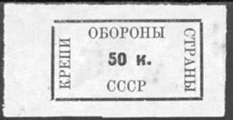1932 г. Разм. рамки 37 х 20 мм. Одноцветная печать на белой бумаге. В прямоугольной рамке в центре номинал. По внутреннему периметру рамки текст: «Крепи обороны страны СССР».