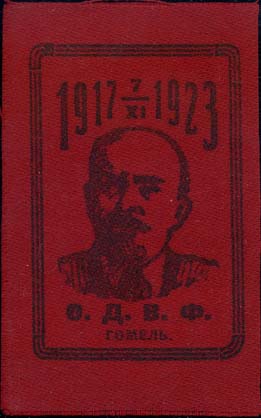 1923 г. 07.11.1923 г. Разм. рамки 34 х 52 мм. Одноцветная печать на ткани различных цветов. В тройной рамке с закругленными углами портрет В.И.Ленина. Сверху даты: «1917 7/XI 1923». Внизу текст в две строки: «О.Д.В.Ф. Гомель».