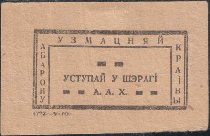 1930(?) г. Разм. 68 х 45 мм. Одноцветная печать на желтовато-серой бумаге. В тройной прямоугольной рамке разм. 53,5 х 27 мм текст на белорусском языке в две строки: «Вступай в кружки О.А.Х». Сверху и по бокам декоративные элементы. По периметру между рамками текст на белорусском языке: «Крепи обо…
