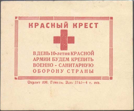 1928 г. Разм. рамки 86 х 71 мм. Одноцветная печать на желтоватой бумаге. В тройной прямоугольной рамке разм. 63 х 40,5 мм в центре красный крест. Сверху текст: «Красный крест». Внизу текст в четыре строки: «В день 10-летия Красной Армии будем крепить военно-санитарную оборону страны». Внизу под р…