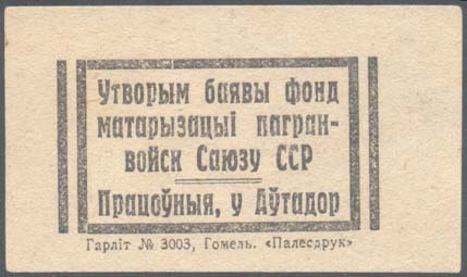 1931 г. 01.-10.10.1931 г. Разм. 71 х 42 мм. Одноцветная печать на желтоватой бумаге. В толстой прямоугольной рамке разм. 44 х 27 мм сверху текст в три строки на белорусском языке: «Создадим боевой фонд моторизации погранвойск Союза ССР». Внизу под двойной чертой текст на белорусском языке: «Трудящ…