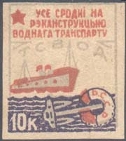 1932 г. Разм. рамки 26 х 30 мм. Трехцветная печать на белой бумаге. В центре пароход в движении и аббревиатура на белорусском языке «ОСВОД». Сверху пятиконечная звезда и текст в три строки на белорусском языке: «Все средства на реконструкцию водного транспорта». В правом нижнем углу спасательный …