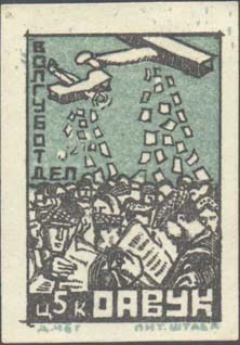 1925 г. Разм. рамки 29 х 45 мм. Двухцветная печать на белой бумаге. Различные рисунки. Текст: «Волгуботдел», внизу «ОАВУК». Внизу под рамкой выходные данные: «Т. НВГ Лит. штаба.»