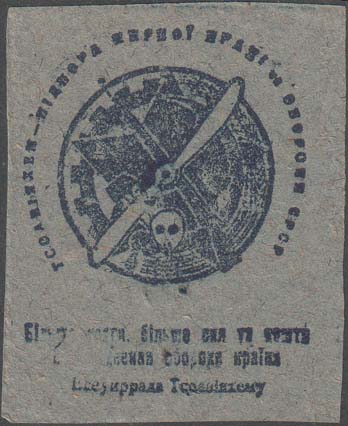 1931 г. Разм. 52 х 65 мм. Одноцветная печать низкого качества на бумаге различных цветов. В центре эмблема ОСОАВИАХИМ. По окружности текст на украинском языке: «ОСОАВИАХИМ – опора мирного труда и обороны СССР». Под эмблемой в центре номинал: «10 к.». Ниже текст в три строки на украинском языке: «…