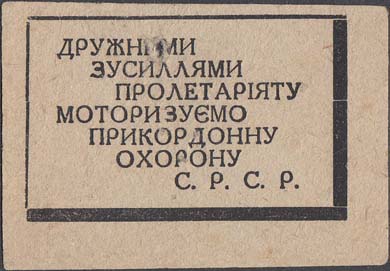 1931 г. 30.101931 г. Разм. рамки 54,5 х 34,5 мм. Одноцветная печать на сероватой (оттенки) бумаге. В прямоугольной рамке текст в семь строк на украинском языке: «Дружными усилиями пролетариата моторизуем пограничную охрану С.С.С.Р.».