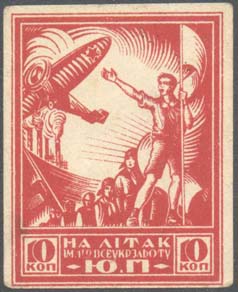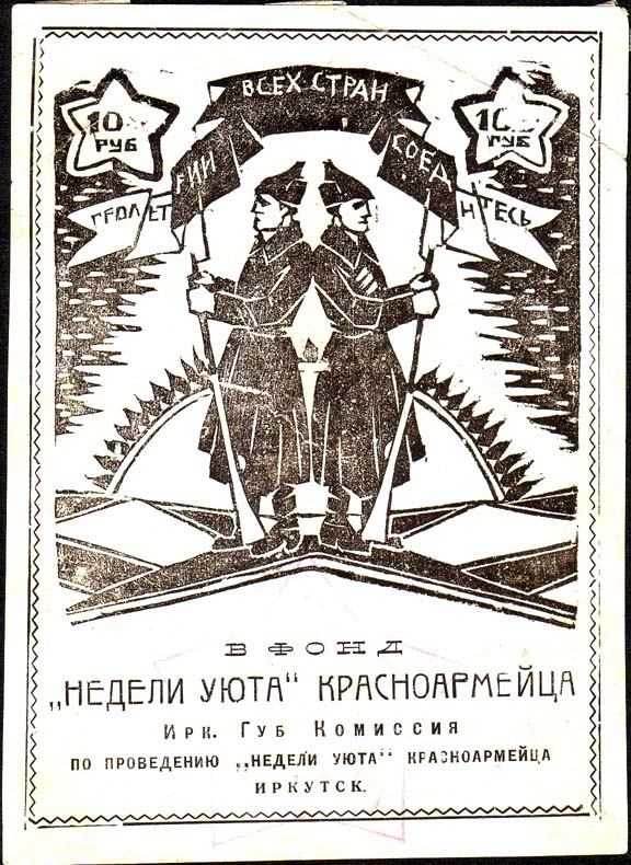 1924(?) г. Листок разм. 96 х 132 мм. Одноцветная печать низкого качества на белой бумаге. В прямо-угольной декоративной рамке разм. 88 х 122 мм в центре двое красноармейцев с винтовками на фоне различных декоративных элементов. Сверху на ленте текст: «Пролетарии всех стран, соединяйтесь». Сверху …