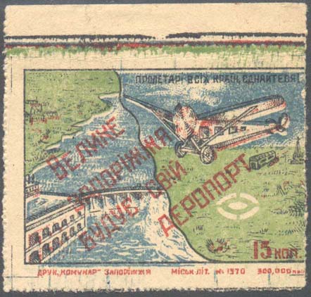 1932(?) г. 1932(?) г. Разм. рамки 67 х 46 мм. Многоцветная печать на толстой желтоватой бумаге низкого качества. Нерегулярная зубц. В прямоугольной рамке в центре самолет, летящий влево над Днепровской ГЭС и аэродромом. В центре по диагонали текст на украинском языке в четыре строки: «Большое Зап…