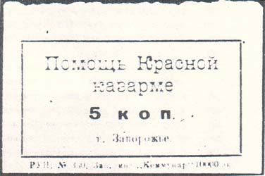 1924 г. Одноцветная печать на розовой бумаге. В прямоугольной рамке в центре номинал. Сверху текст в две строки: «Помощь Красной казарме». Внизу текст: « г. Запорожье». Внизу под рамкой выходные данные мелким шрифтом.