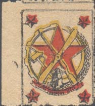 1923 г. Листок из квитанционной книжки разм. рамки 52 х 36 мм. Одноцветная печать на розово-красной бумаге. Левосторонняя зубц. 11 1/2. В центре в овальном венке красноармеец, рабочий и крестьянин на фоне восходящего солнца, поля и завода. Красноармеец в руках держит флаг с датами: «1918-1923». С…