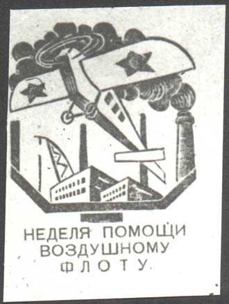 1923 г. Разм. 53 х 72 мм. Одноцветная печать на желтоватой бумаге. На фоне заводских зданий самолет-моноплан, летящий влево вверх. Внизу текст в три строки: «Неделя помощи воздушному флоту».
