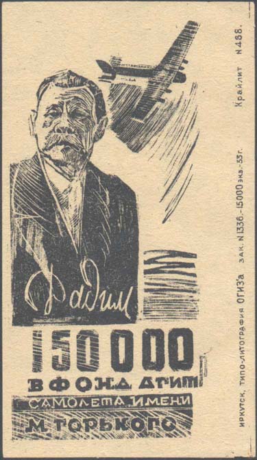 1933 г. Листок разм. 62 х 111 мм. Одноцветная печать на желтоватой бумаге. В центре слева портрет А.М.Горького. Справа сверху многомоторный самолет в облаках. Внизу текст в пять строк: «Дадим 150000 р. в фонд агитсамолета имени М. Горького». Слева вертикально снизу вверх мелким шрифтом выходные …