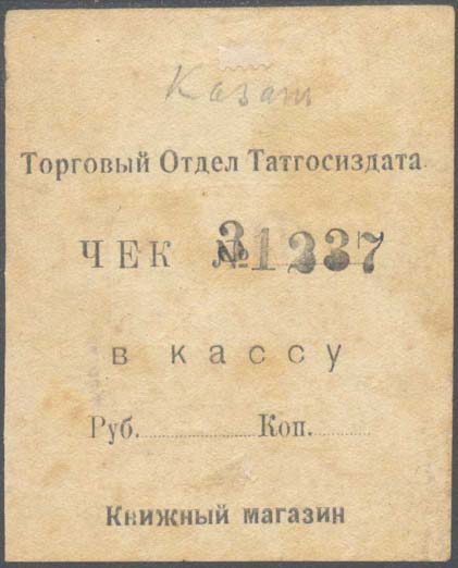 1923 г. Разм. 71 х 86 мм. Одноцветная печать на желтоватой бумаге. На лицевой стороне текст в пять строк: «Торговый Отдел Татгосиздата Чек № .. в кассу Руб... Коп... Книжный магазин». На оборотной стороне фиолетовый оттиск прямоугольного штампа разм. рамки 32 х 53 мм. Прямоугольная рамка штампа р…