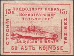1930(?) г. Разм. рамки 39 х 24 мм. Одноцветная печать на сероватой бумаге. В прямоугольной рамке в центре подводная лодка в надводном положении. Слева и сверху текст: «Строим подводную лодку «Воинствующий Безбожник»» и номинал. Справа и внизу текст на татарском языке латинским шрифтом и номинал. …