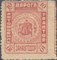1932 г. Разм. рамки 23,5 х 29 мм. Одноцветная печать на желтоватой бумаге. В центре в двойной прямоугольной рамке круглая рамка, стилизованной под автопокрышку. В круглой рамке автомобиль с шофером за рулем на фоне гор. По периметру прямоугольной рамки текст: «Автомобиль. Дорога. Трактор. Закавто…