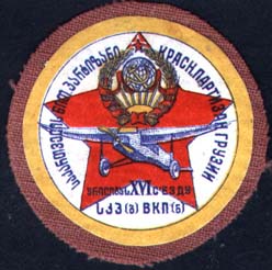 1932(?) г. Составной знак. Круг диаметром 36 мм. Многоцветная печать на белой бумаге с подкладкой из красной материи. В круглой рамке на фоне красной звезды герб СССР и самолет. Текст на русском и грузинском языках: «Красн[ый]. Партизан Грузии XVI съезду В.К.П.(б)».