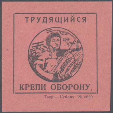 1927 г. Разм. рамки 46 х 44 мм. Одноцветная печать на розовой бумаге. В центре в круглой рамке рабочий с винтовкой на фоне аграрно-индустриального пейзажа. Сверху самолеты в облаках. Текст в две строки: «Трудящийся крепи оборону». Справа внизу под рамкой мелким шрифтом выходные данные: «Тверь Губ…