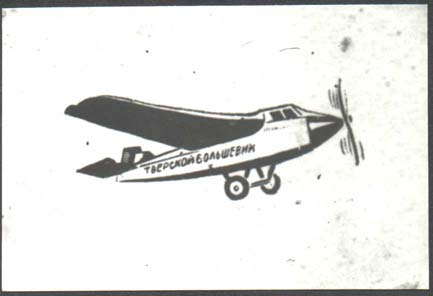 1931 г. 01.11.1931 г. Разм. 72 х 48 мм. Одноцветная печать на белой бумаге. Самолет «Тверской большевик», летящий вправо.