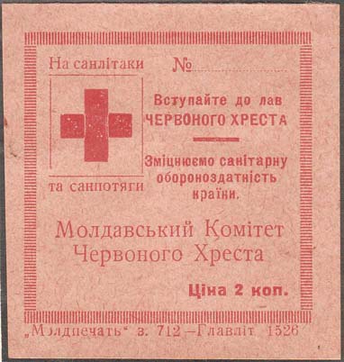 1932 г. Разм. рамки 49 х 49 мм. Одноцветная печать на толстой белой бумаге со сплошным фоном на лицевой стороне. В левом верхнем углу красный крест в прямоугольной рамке. Сверху над рамкой текст на украинском языке: ««На сансамолеты». Внизу под рамкой продолжение текста на украинском языке: «И са…