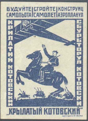 1927(?) г. Разм. рис. 41 х 47 мм. Одноцветная печать на белой бумаге. Нерегулярная зубц. и Б.З. В центре всадники и летящий над ними самолет-биплан. Текст на русском, украинском и молдавском языках: «Строим самолет «Крылатый Котовский»». Внизу мелким шрифтом выходные данные: «Одесса, 3-я гостип».