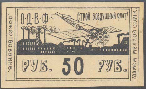 1923 г. Разм. рамки 71 х 39 мм. Одноцветная печать на серовато-желтой бумаге. В двойной прямоугольной рамке самолет-моноплан «Томгублет» над заводскими зданиями. Сверху текст: «О.Д.В.Ф. Строй Воздушный Флот!». Внизу номинал. Справа и слева между линиями рамки вертикально текст: «Пожертвование. Вз…