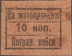 1931 г. Разм. рамки 18,5 х 14 мм. Одноцветная печать на светло-коричневой бумаге. В прямоугольной рамке центре номинал. Сверху текст: «На моторизацию». Внизу продолжение текста: «Погран[ичных]. войск»