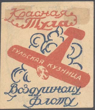 1926(?) г. Разм. 51 х 60 мм. Двухцветная двухсторонняя печать на кремовой бумаге. На лицевой стороне самолет «Тульская кузница», летящий в облаках влево вниз. Текст в четыре строки: «Красная Тула Воздушному Флоту». На оборотной стороне в декоративной рамке пятиконечная звезда с аббревиатурой С.С.…