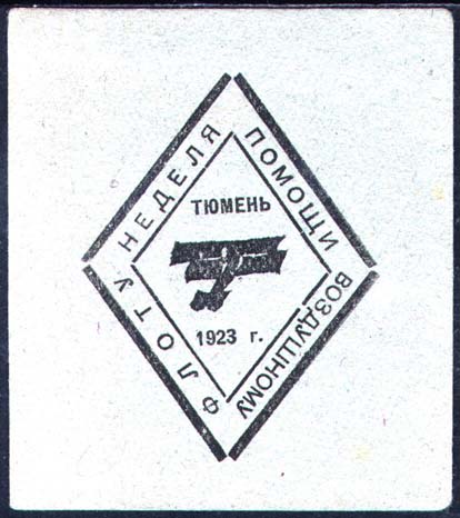 1923 г. Разм. 68 х 71 мм. Одноцветная печать на серо-зеленой бумаге. В центре в двойной ромбовидной рамке разм. 46 х 59 мм самолет-биплан. Сверху текст: «Тюмень». Внизу дата: «1923 г.». Между рамками текст: «Неделя помощи воздушному флоту».