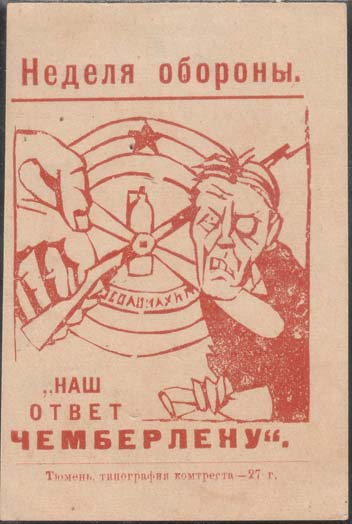 1927 г. Разм. 60 х 87 мм. Одноцветная печать на желтоватой бумаге. В прямоугольной рамке разм. 50 х 54 мм аллегорический рисунок: на фоне значка Осоавиахима рука и голова Чемберлена, зажатая между винтовкой и пропеллером эмблемы. Сверху над рамкой текст: «Неделя обороны». Внизу под рамкой текст: …