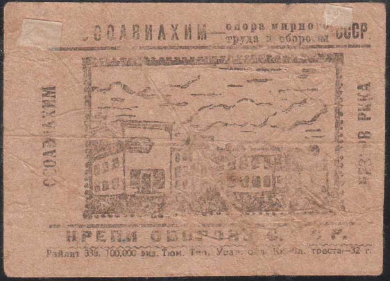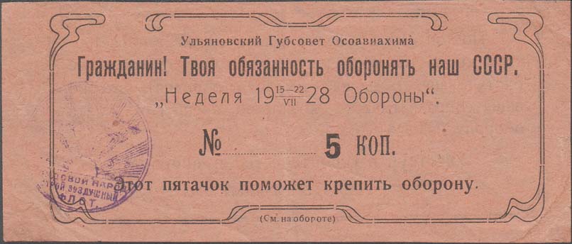 1928 г. 15.-22.07.1928 г. Листок разм. 130 х 58 мм. Одноцветная двухсторонняя печать на желтовато-серой бумаге. На лицевой стороне в декоративной рамке текст в пять строк: «Ульяновский Губсовет Осоавиахима. Гражданин! Твоя обязанности оборонять наш СССР. «Неделя 15.-22./VII 1928 обороны». № ... 5 …