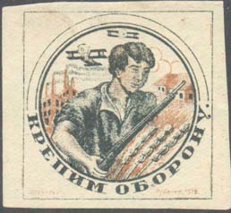1930(?) г. Разм. 40 х 40 мм. Одноцветная и двухцветная печать на плотной белой бумаге. В прямо-угольной рамке разм. 35 х 35 мм вписана круглая рамка. В круглой рамке в центре рабочий с винтовкой на фоне аграрно-индустриального пейзажа. Сверху два самолета-биплана. Под рамкой текст: «Крепи оборону…