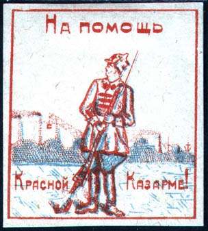 1926 г. Разм. рамки 45 х 51 мм. Двухцветная печать на желтоватой бумаге. В прямоугольной рамке в центре красноармеец с винтовкой на фоне индустриального пейзажа. Сверху текст: «На помощь». Внизу продолжение текста: «Красной Казарме!».