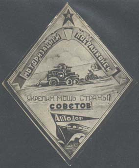 1930(?) г. Круг диаметром 30 мм. Одноцветная печать на белой глянцевой фотобумаге. В центре бронеавтомобиль. Сверху полукругом текст: «Моторизацией погранвойск». Внизу продолжение текста в две строки: «Укрепим мощь страны советов». Внизу полукругом текст: «Автодор».