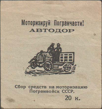 1930(?) г. Разм. 70 х 74 мм. Одноцветная печать на светло-зеленой бумаге. В центре схематичное изображение автомобиля. Сверху текст в две строки: «Моторизуй Погранчасти! Автодор». Внизу текст в две строки: «Сбор средств на моторизацию Погранвойск СССР». Справа внизу номинал.