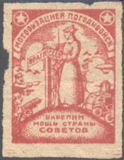 1930(?) г. Разм. рамки 36 х 43 мм. Двухцветная печать на белой бумаге. Зубц. 11 1/2. В двойной прямоугольной рамке с декоративными элементами в верхних углах вписана двойная круглая рамка. В центре круглой рамки красный крест. По периметру между круглыми рамками текст: «Все силы Красного Креста д…