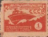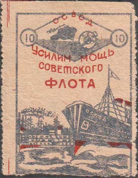 1932 г. Разм. рамки 39 х 53 мм. Двухцветная печать желтоватой бумаге. В центре текст в три строки: «Усилим мощь советского флота». Сверху эмблема ОСВОД и номинал. Внизу пароход «ОСВОД» на фоне гавани.