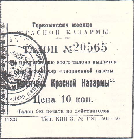 1925 г. Листок из квитанционной книжки разм. 78 х 81 мм. Одноцветная печать на тонкой плотной белой бумаге. Левосторонняя зубц. 13 1/2. В центре текст в восемь строк: «Горкомиссия месяца Красной Казармы. Талон №... По предъявлению этого талона выдается один экземпляр одно-дневной газеты «Месячник…