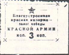 1925 г. Разм. рамки 29,5 х 20 мм. Одноцветная печать на фиолетовой бумаге. В прямоугольной рамке с декоративными элементами по углам в центре текст в четыре строки: «Благоустроенная красная казарма – залог победы Красной Армии». Сверху пятиконечная звезда, внизу номинал.