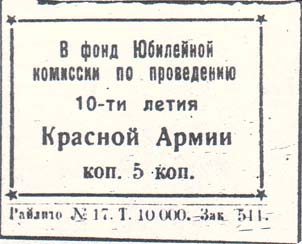 1927 г. Одноцветная печать на бумаге различных цветов и качества. В прямоугольной рамке разм. 43 х 29 мм с декоративными элементами в виде звездочек по углам в центре текст в четыре строки: «В фонд Юбилейной комиссии по проведению 10-летия Красной Армии». Ниже номинал. Внизу под рамкой мелким шри…