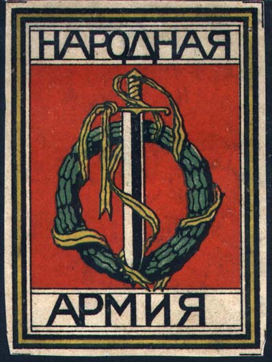1919(?) г. Разм. рамки 61 х 84 мм. Многоцветная печать на желтоватой бумаге. В центре в тройной прямоугольной рамке круглый венок, перевитый лентой и меч. Текст: «Народная армия».