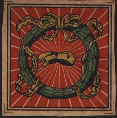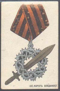 1920(?) г. Разм. 32 х 49 мм. Многоцветная печать на белой бумаге. В центре наградой знак белого движения: терновый венец и меч на колодке. Внизу мелким шрифтом выходные данные: «Иос. Корот Владивосток».