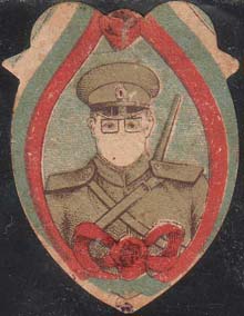 1919(?) г. Разм. рамки 60 х 61 мм. Многоцветная печать на желтоватой бумаге. В центре на фоне лучей солдатская шапка и фуражка в обрамлении венка перевитого георгиевской лентой.