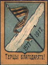 1917 г. Разм. 27 х 37 мм. Трехцветная печать на сероватой бумаге. В центре герб Терской области и дата: «1577-1917». Внизу текст: «Терцы благодарят!».