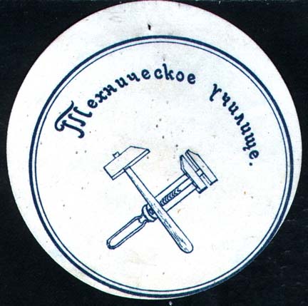 1916 г. 10.11.1916 г. Круг диаметром 70 мм. Одноцветная печать на белой бумаге. В центре в двойной круглой рамке диаметром 61,5 мм скрещенные разводной ключ и молоток. Сверху полукругом текст: «Техническое училище».