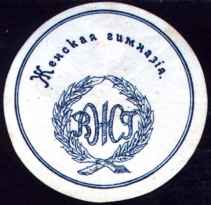 1916 г. 10.11.1916 г. Круг диаметром 70 мм. Одноцветная печать на белой бумаге. В центре в двойной круглой рамке диаметром 61,5 мм аббревиатура «ВЖГ» в обрамлении венка из лавровых листьев. Сверху полукругом текст: «Женская гимназия».