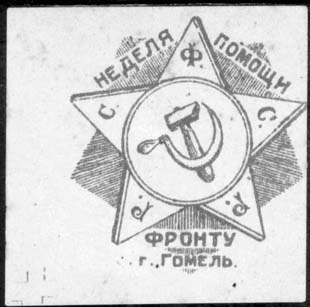 1922 г. 22.10.1922 г. Разм. 51 х 51 мм. Одноцветная печать на желтоватой бумаге. Пятиконечная звезда, в центре которой в круге серп и молот. В лучах буквы аббревиатуры: «Р.С.Ф.С.Р.». Сверху между лучами текст: «Неделя помощи». Внизу продолжение текста в две строки: «Фронту г. Гомель».