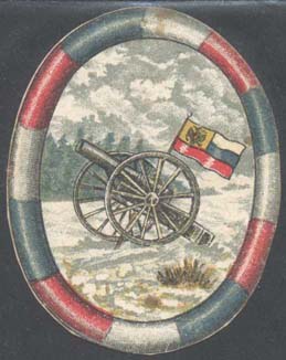 1914 г. 06.12.1914 г. Овал разм. 43 х 53 мм. Многоцветная печать на плотной белой бумаге. В овальной рамке из поперечных полос цветов российского флага в центре орудие и новый национальный флаг России. На заднем плане лес.